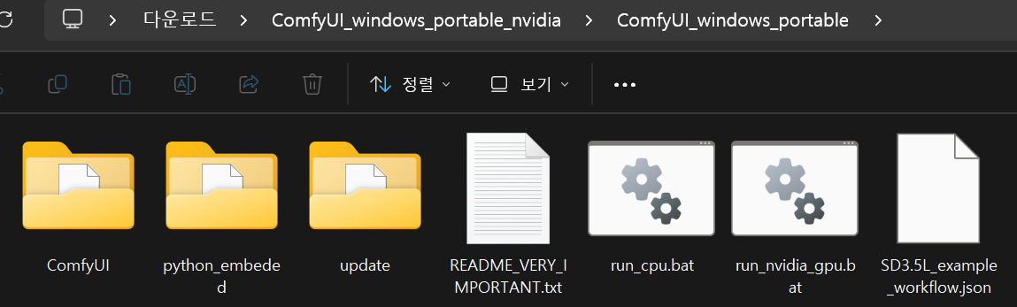 받은 파일을 순서대로 여기에 넣는다. checkpoints폴더에 Stable Diffusion 3.5파일을 넣고 clip 폴더에 나머지 세개 파일을 다 집어 넣는다.