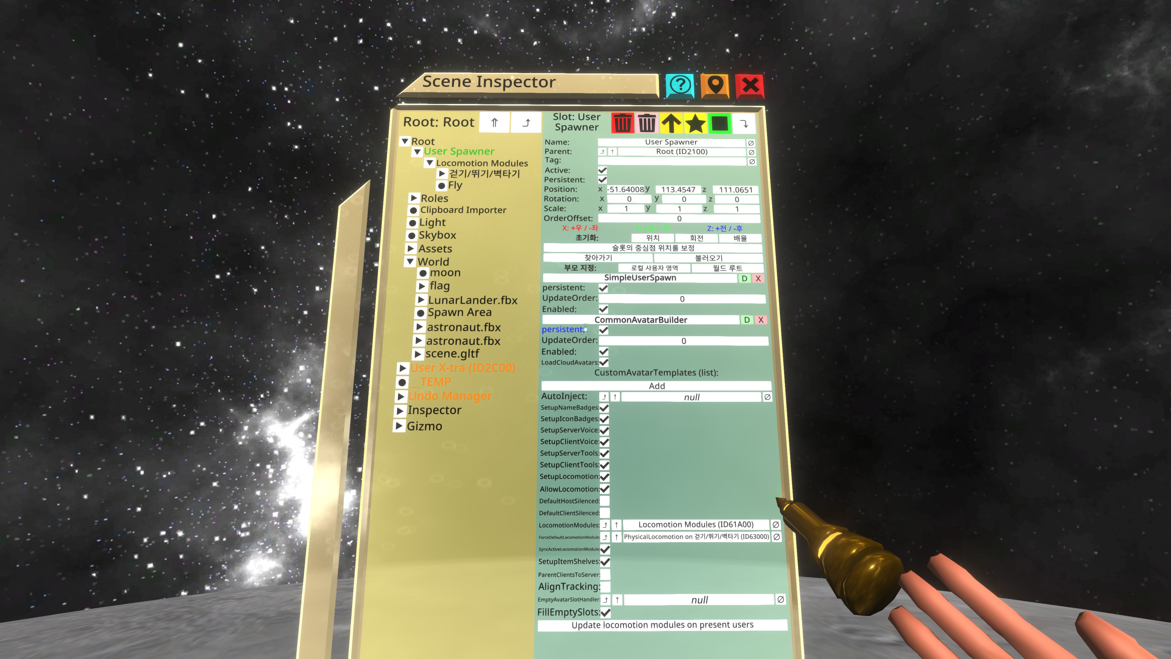 빈 곳에는 사물의 정보가 있었다. 그러니까 여기에 달을 연결하면 달에 중력이 있는것 처럼 걸을 수 있다.