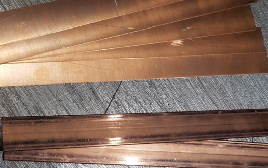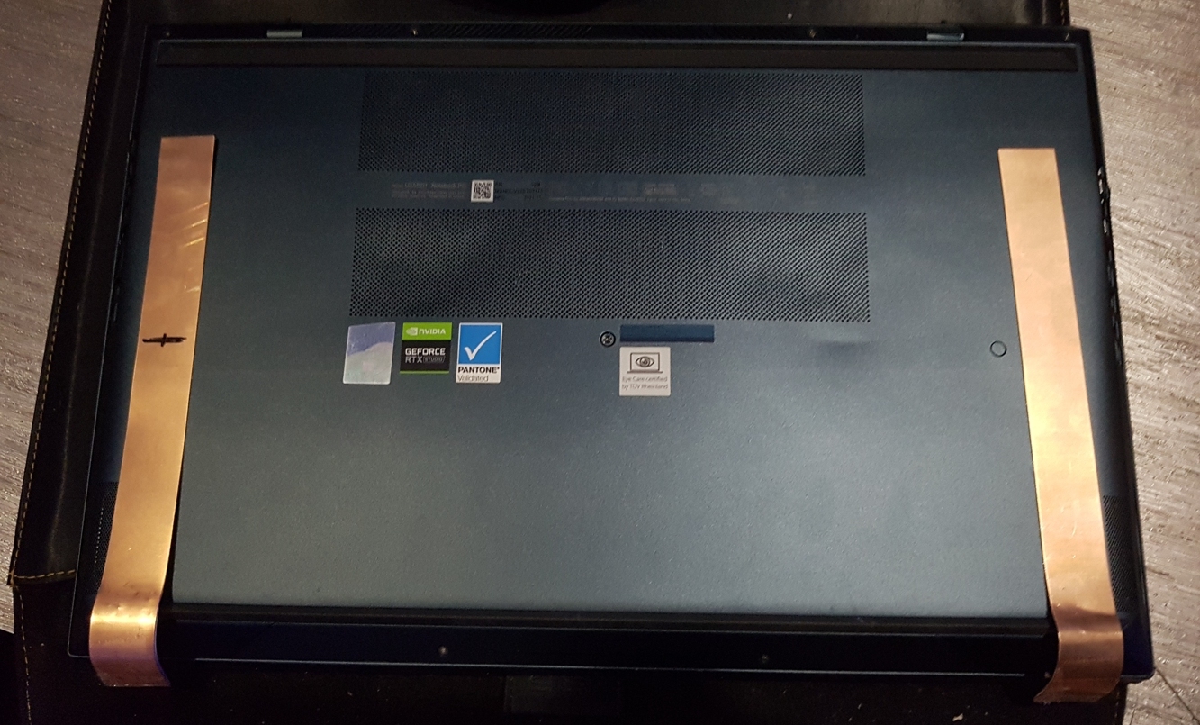반면 노트북 하판에는 20cm 길이에 2cm폭을 가진 0.3mm 구리를 양면 테이프를 사용해 붙였다. 위 사진에 구리가 길게 붙어 있는 모습을 확인 할 수 있다. 외부에서는 접착력이 떨어저도 큰 문제가 발생하지 않는다. 또 검색해보니 테이프는 얇은 만큼 열 전도에 큰 방해가 되지 않는다고 한다. 얼마나 방해가 되지 않는지 모르지만 부착 후 가열된 상태에서 손을 대보면 통증이 느껴질 정도의 열을 느낄 수 있으니 거의 방해가 없다고 보면 될것이다. 구리를 길게 붙인 이유는 노트북에서 가장 차가운 키보드와 베터리 지점까지 열을 전달하기 위해서인데 조금이지만 열이 이동한다. 가장 뜨거운지점에는 최종적으로는 동일한 폭의 2mm 두께의 10cm 구리를 추가할 생각이다.