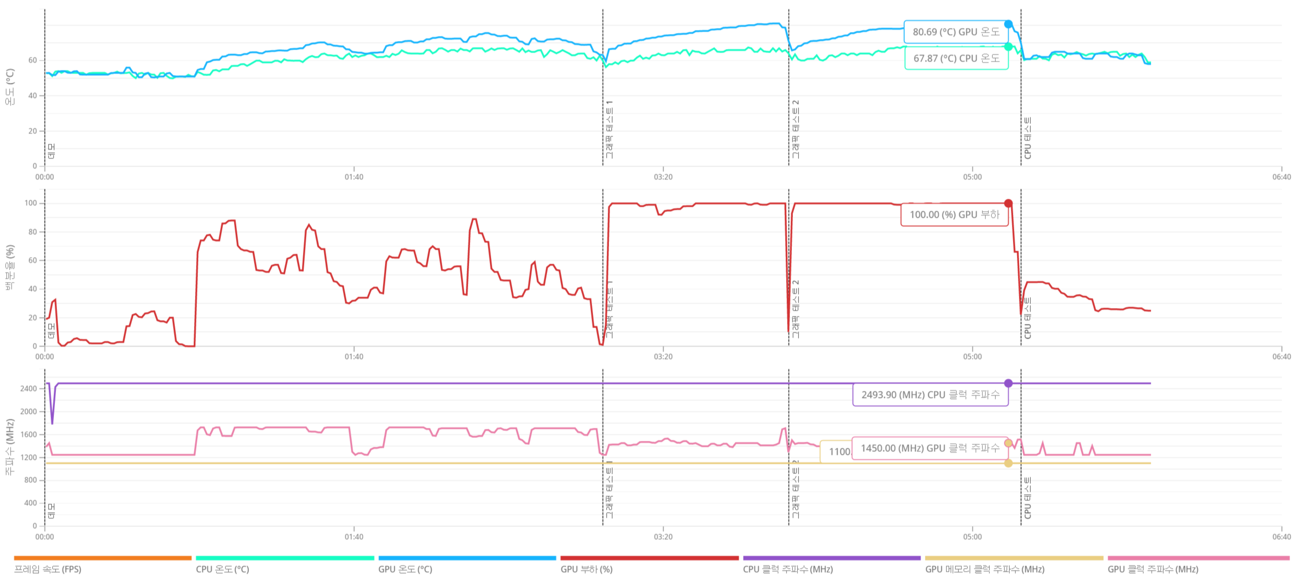 벤치 테스트 과정에서 그래픽 테스트 구간의 온도가 매우 안정적이다. 그래프 전체를 보아도 90도를 넘는 경우가 매우 드물다. 이런 온도 지금까지 테스트 하면서 한번도 본적이 없다. 다만 CPU구간의 상태가 여전히 이해가 되지 않는다. GPU부하가 낮아짐에도 불과하고 엄청난 발열이 나오고 있고 CPU가 같은 성능을 계속 유지하는 것 처럼 보이는데 프레임 하락이 크다.