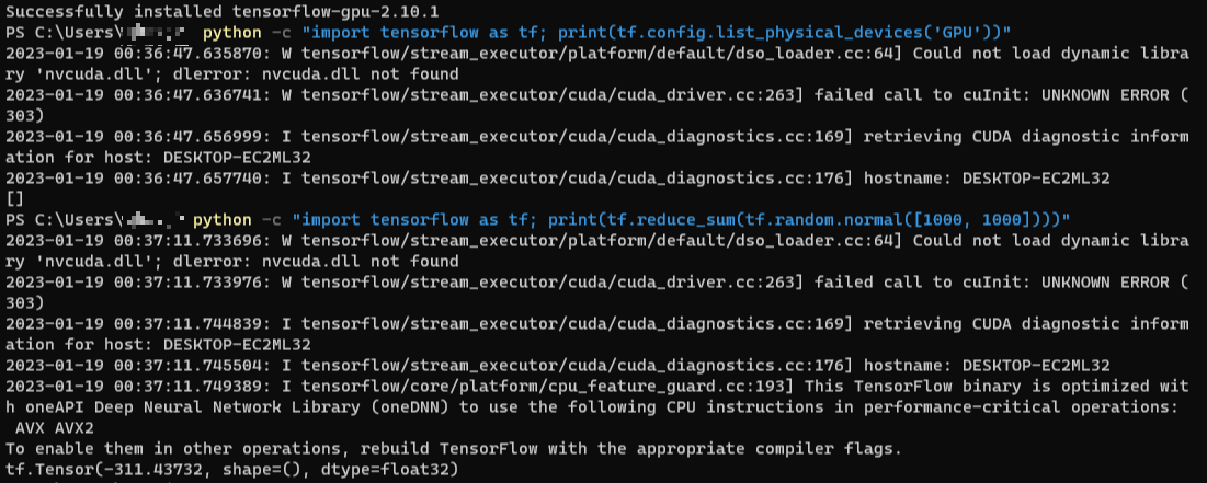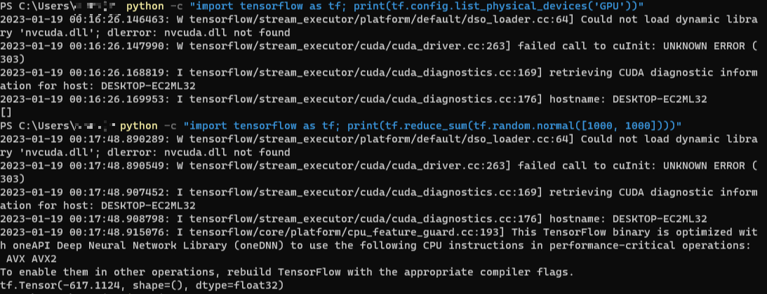 다른 컴퓨터에 설치한 결과이다. GPU 버전은 본래 지포스 그래픽 카드가 필요하니 당연히 이 내용은 실패했다는 말이다.